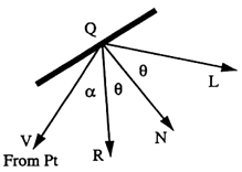 Specular reflection is observed on any shiny surface. For example, when an apple is illuminated with a white light, a bright spot is found in the illuminated region of its surface, which adds a ‘shine’ to it. If one moves his ahead, the bright spot also moves a bit. This means the distribution of illumination is subject to the viewer’s position. This is called specular reflection. The resulting intensity due to diffuse Reflection is given by \(I = K_sI_pcos^n\alpha\) where \(K_s\) is the material’s specular-reflection coefficient, ranging in \([0, 1]\), and \(n\) is its specular-reflection exponent. A higher value of \(n\) creates a smaller and brighter spot. \(\alpha\) is the angle between direction from point to camera and the reflected ray.